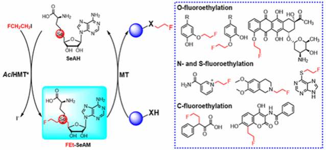 该研究成果于2024年3月以“Enzymatic Fluoroethylation by a Fluoroethyl Selenium Analogue of S-Adenosylmethionine”为题发表在ACS Catalysis(一区)杂志,论文第一作者为我校化工学院博士研究生余南海,通讯作者为化工学院董敏教授。