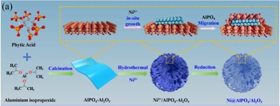 镍基催化剂在通过 C-O 断裂对木质素衍生物进行加氢脱氧以产生环烷烃方面应用广泛。然而,它们通常难以在温和条件下实现高活性,且稳定性相对较差。研究中成功合成了表面经磷酸铝修饰的镍基催化剂(Ni@AlPO₄/Al₂O₃),可将愈创木酚高效转化为环己烷。在反应条件较为温和(230°C、1 兆帕氢气、2 小时)的情况下,该催化剂实现了 99.1% 的愈创木酚转化率和 92.9% 的环己烷产率。使用气相色谱-质谱联用技术,对反应产物进行了定性和定量分析,评价了催化剂的性能,并对反应机理进行了探究。值得注意的是,该催化剂在连续6个循环中仍保持活性,并在半转化实验中展现出稳定的性能。机理研究表明,AlPO₄在镍表面适度覆盖并形成 Niδ+-AlPO₄界面,显著增强了 C-OCH₃和 C-OH 键的断裂,促进了甲氧基环己醇和环己醇向环己烷的转化,最终推动了环己烷的生成。除了对愈创木酚起作用外,Ni@AlPO₄/Al₂O₃-0.3 对多种木质素衍生单体和二聚体转化为环烷烃方面均展现了广泛的适用性。它还具备断裂木质素衍生 C-C 二聚体中 C-C 和 C-O 键的能力,这使得从杨木木质素的解聚过程中获得了 27.1%(质量分数)的环烷烃产率。该研究提出的通过 AlPO₄修饰镍表面的催化剂设计策略,为生物质利用过程中镍基催化剂的改进提供了宝贵的思路。