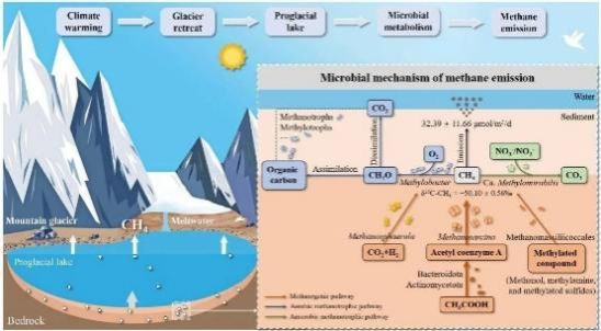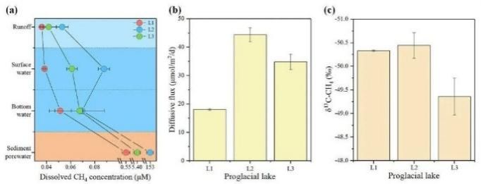 采用同位素比质谱技术(IRMS)技术,对于青藏高原3个新出现的高海拔冰前湖(~5500 m a.s.l.)沉积物进行分析,发现沉积物产生甲烷的δ13C-CH4为(-50.10±0.56‰),沉积物中的CH4可能是微生物通过乙酸发酵型途径产生的。与其它冰川地区相比,这些冰前湖沉积物中富集了更多的13C,这可能与高原特有的底物限制环境相关。沉积物中生成的CH4进入水体后不断被消耗,最终以32.39±11.66 μmol/m2/d的速率通过水-气界面扩散排放到大气中。研究表明青藏高原新形成冰前湖在CH4排放方面的生态重要性,以及该地区CH4循环微生物群落及其功能基因的独特性,这将有助于人们对冰冻圈碳循环的理解及对冰前湖生态系统的重视。