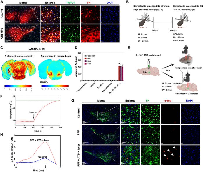 报道了一种光热无线深部脑刺激纳米系统(ATB NPs,Au@TRPV1@β-syn (ATB) NPs),可清除α-突触核蛋白聚集体并修复黑质区退化的多巴胺神经元,用于帕金森病治疗。利用激光剥蚀电感耦合等离子体质谱联用技术(LA-ICP-MS)表征了ATB NPs在小鼠脑内的分布,将ATB NPs注射到小鼠的脑内,制备冠状脑切片样品,并在24小时后通过激光烧蚀原位表征标记物金元素。发现金元素信号集中于黑质区至少5周,表明注射的ATB NPs主要定位并稳定地停留在大脑黑质区,很少扩散到海马和皮层等其他区域。证明了ATB NP介导的无线深部脑刺激可以通过精确的空间控制完全逆转多巴胺神经元死亡,并将帕金森模型小鼠的运动行为恢复到正常水平。