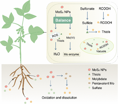 二硫化钼纳米材料由于其独特的酶模拟特性,在生物医学和催化领域具有巨大的应用潜力。为了探究三种不同尺寸的纳米二硫化钼的差异机制,利用单颗粒电感耦合等离子体质谱联用技术(SP-ICP-MS)全面分析了二硫化钼在土壤-大豆体系中30,60和90天的转化动态,研究了纳米二硫化钼在土壤-大豆系统中的生命周期转化,证明纳米二硫化钼的粒径分布在不同植物组织中存在时间差异,其中较小的颗粒是由纳米二硫化钼转化产生的,这提高了它们穿过植物屏障的能力。根、芽和根瘤中颗粒大小的变化以及根中次生峰的出现,为植物体内纳米二硫化钼的转化提供了直接证据,揭示了纳米二硫化钼的多功能性导致生物固氮和产量增加的机制,为农业中利用纳米材料的潜在好处和挑战提供了见解。