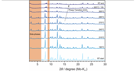 2020年Christian Ochsenfeld和Bettina V. Lotsch教授通过将熔融盐合成方法引入COFs合成中,首次实现了非溶剂热合成COFs。该文通过原位XRD表征,对COFs合成过程中的混合原料晶相的变化提供了时间示踪解析。随着温度的升高,原料混合物中ZnCl2的衍射峰逐渐变弱、消失,同时在低角度出现COF的特征衍射峰,当温度继续升高至300℃,原料和COF的衍射峰均变弱。原位变温XRD对精准调控COFs晶相生成温度和时间、关联表观颜色变化与晶相变化提供了全面视角。