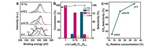 该工作通过XPS表面元素氧化态分析,揭示了Ti替代对Ni和Ti氧化态的调控作用。Ni 3p谱表明,随着Ti掺入量增加,Ni³⁺比例显著降低,说明Ti通过电荷补偿效应降低Ni的氧化态。O 1s谱解析出四类氧物种与反应路径关联。在准原位XPS测试中,20mg样品在氩气氛围中加热至800℃,随后在常压条件下与5%甲烷/氩气混合气反应10分钟。冷却后,在氩气保护下通过样品杆将样品转移至分析室,全程避免接触空气。表征结果显示还原后氧物种动态迁移,但Ti替代样品仍维持较低O₄比例。XPS通过定量分析表面元素氧化态和氧物种分布,揭示了Ti替代通过调控氧物种类型(抑制电亲性O₄,增强核亲性O₆)优化催化剂性能的机制。