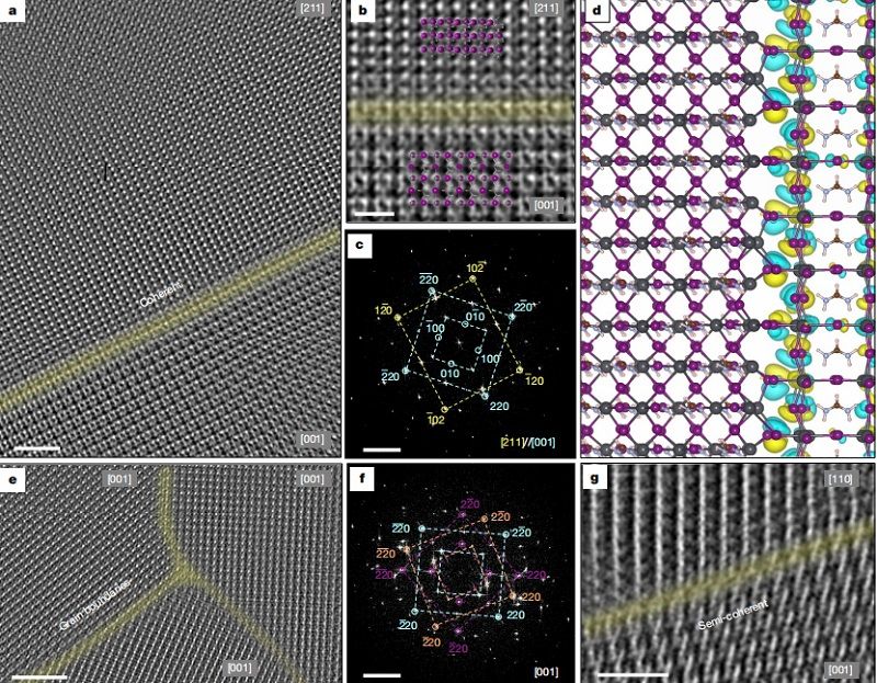 该工作研究了稳定的环境温度对微米级钙钛矿厚膜中高密勒指数晶面择优取向的直接作用,并通过环境温度精细调控实现了高质量微米级钙钛矿厚膜的可控制备,最终显著提升了不同活性面积的反式钙钛矿太阳能电池的综合光伏性能。这为实现高性能钙钛矿太阳能电池提供了重要的方法指导。在该工作中,通过透射电镜直接获取钙钛矿晶面的原子像,发现在(211)取向晶粒与(001)取向晶粒之间形成了“相干晶界”,抑制了晶界位置的悬挂键、点缺陷、位错等,为深入理解环境温度与晶体质量内在关联性提供了重要支撑。
