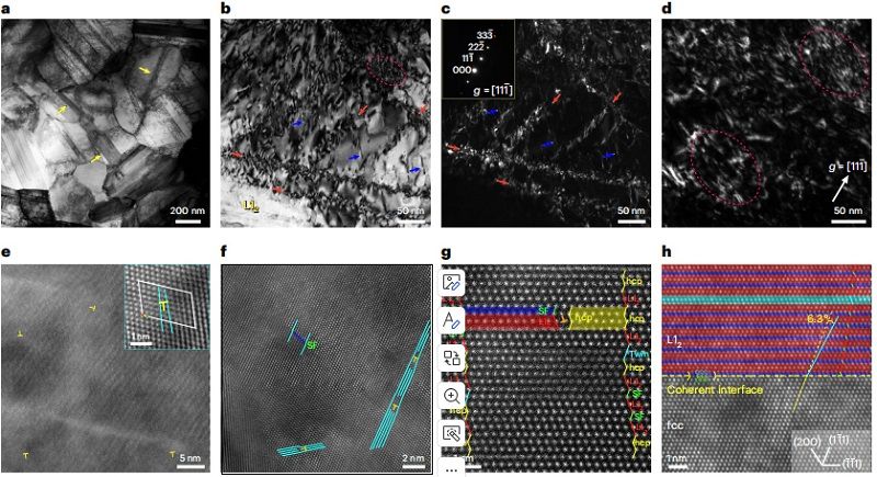 该工作发现多主元VCoNi合金纳米结构的初始拉伸变形是吕德斯带(Lüders band)扩展,一旦吕德斯带开始扩展,在其前端就已经发生了塑性失稳,在颈缩处随即形成了三轴应力状态,快速产生了高密度位错,这些位错引起了林位错加工硬化和异质变形诱导硬化,后者是几何必需位错与化学短程有序的应变场之间交互作用的结果。在吕德斯带扩展过程中,加工硬化体现出关键作用,反过来抑制并稳定住了吕德斯带的失稳扩展,还使纳米结构进行均匀变形。该工作利用透射电镜对拉伸变形在晶粒内部形成、增殖并储存的位错,位错之间以及位错与界面和析出相等的交互作用进行了深入细致的显微表征,拓展了长期以来教科书中对于吕德斯带变形的传统理解,揭示了高强纳米结构中之前未知的吕德斯带变形物理,并为研发高力学性能金属材料及其极端环境应用提供了新思路。