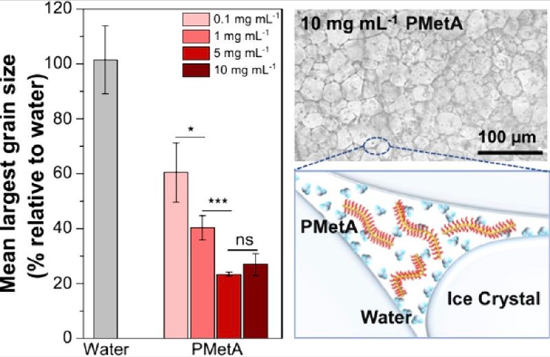 冰晶的形成对许多领域(如工业过程、生物保存等)都构成了重大挑战,开发抗冻剂并阐述其抗冻机制已经引起了广泛的关注。为此,合成了一系列聚(L-蛋氨酸)衍生物, 并研究了聚合物结构与抑制冰再结晶(IRI)活性之间的关系,结果表明,两性离子PMetA显示出最高的IRI活性,在10 mg/mL时相对水的IRI活性为27.0%±3.9%。低场核磁共振和差示扫描量热法的结果表明,IRI活性与氢键断裂的活化能有关。PMetA在10.0 mg/mL时表现出可接受的细胞相容性和良好的冷冻保护效率。这一发现为揭示抗冻机制提供了重要见解,对开发高效冷冻保护剂具有重要参考价值。