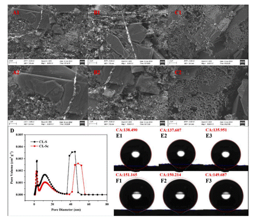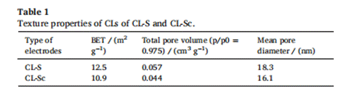 H2O2是一种环保化学试剂,广泛应用于纸浆漂白、纺织、化工等制造业,将H2O2应用于高级氧化工艺(AOPs)时可以将大部分有机物氧化为H2O和CO2。电化学合成H2O2因其高效、绿色等特点,被认为具有较高的发展潜力和可持续性。目前用于合成H2O2的ORR阴极催化剂的选择性、氧传质和阴极界面的电子转移是影响H2O2产率的三个重要因素。基于此,该课题组通过简化电极结构、调整催化界面等方法,优化了超疏水炭黑-石墨双层吸气阴极的性能,并提高其长期工作的稳定性。通过比较CL-Sc和CL-S两种电极间孔结构的变化,为研究反应机理提供重要数据。煅烧后的电极通过平均孔径和比表面积值的变化证明煅烧过程重塑了电极内部孔结构。