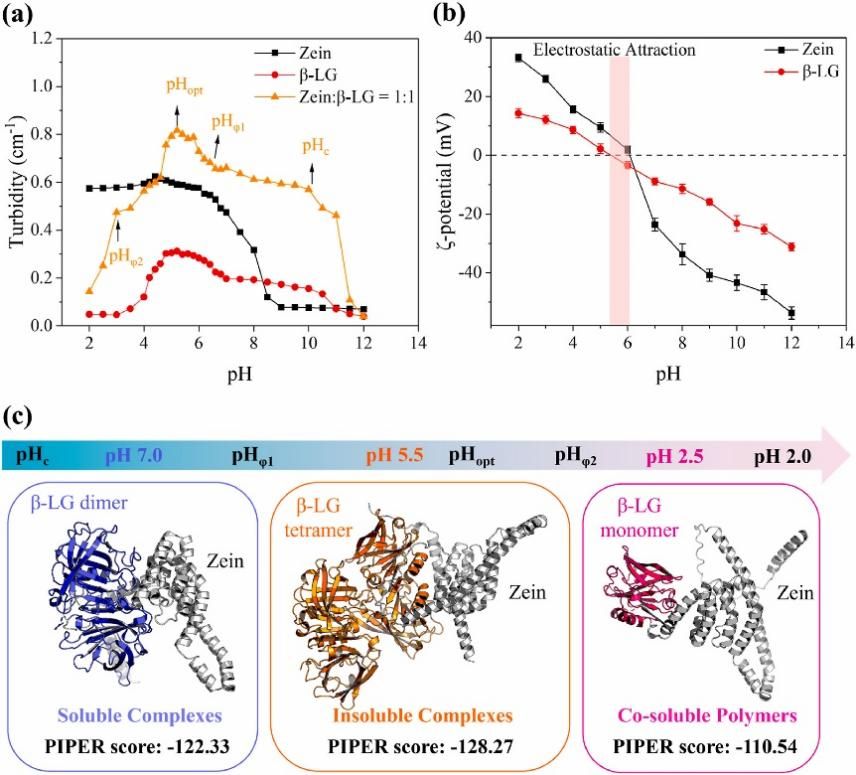 以玉米醇溶蛋白(Zein)和β-乳球蛋白(β-lactoglobulin, β-LG)作为模型蛋白,探讨(-)-表没食子儿茶素-3-没食子酸酯(EGCG)对其相互作用机制的调控作用。为了验证理论计算结果,研究还进行了实验验证,结果表明,浊度、粒径和Zeta电位(ζ-potential)数据均显示,EGCG促进了Zein–β-LG复合物的聚集与稳定。EGCG的结合显著改变了复合物的二级结构和表面性质。