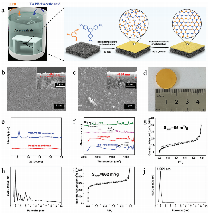 共价有机框架(COFs)是一类多孔晶体材料,在催化、吸附、分离和传感等领域具有应用潜力,该团队提出了以多孔Al2O3为基底,利用微波辅助制备出高度结晶、稳健的TFB-TAPB共价有机框架(COF)膜的新型策略,并利用相关技术对该材料进行表征。通过BET法计算收集的反应釜底部随原始膜和COF膜生成的颗粒的比表面积。结果表明随原始膜生成的颗粒比表面积较低,仅为65 m2/g,且孔径分布较宽。经过微波处理后,随COF膜生成的颗粒比表面积显著提高,达到862 m2/g,且孔径分布集中在1.061 nm处,其比表面积在该过程中显著增加,证实微波处理可以促进无定形聚合物向结晶共价有机框架(COF)的转变。