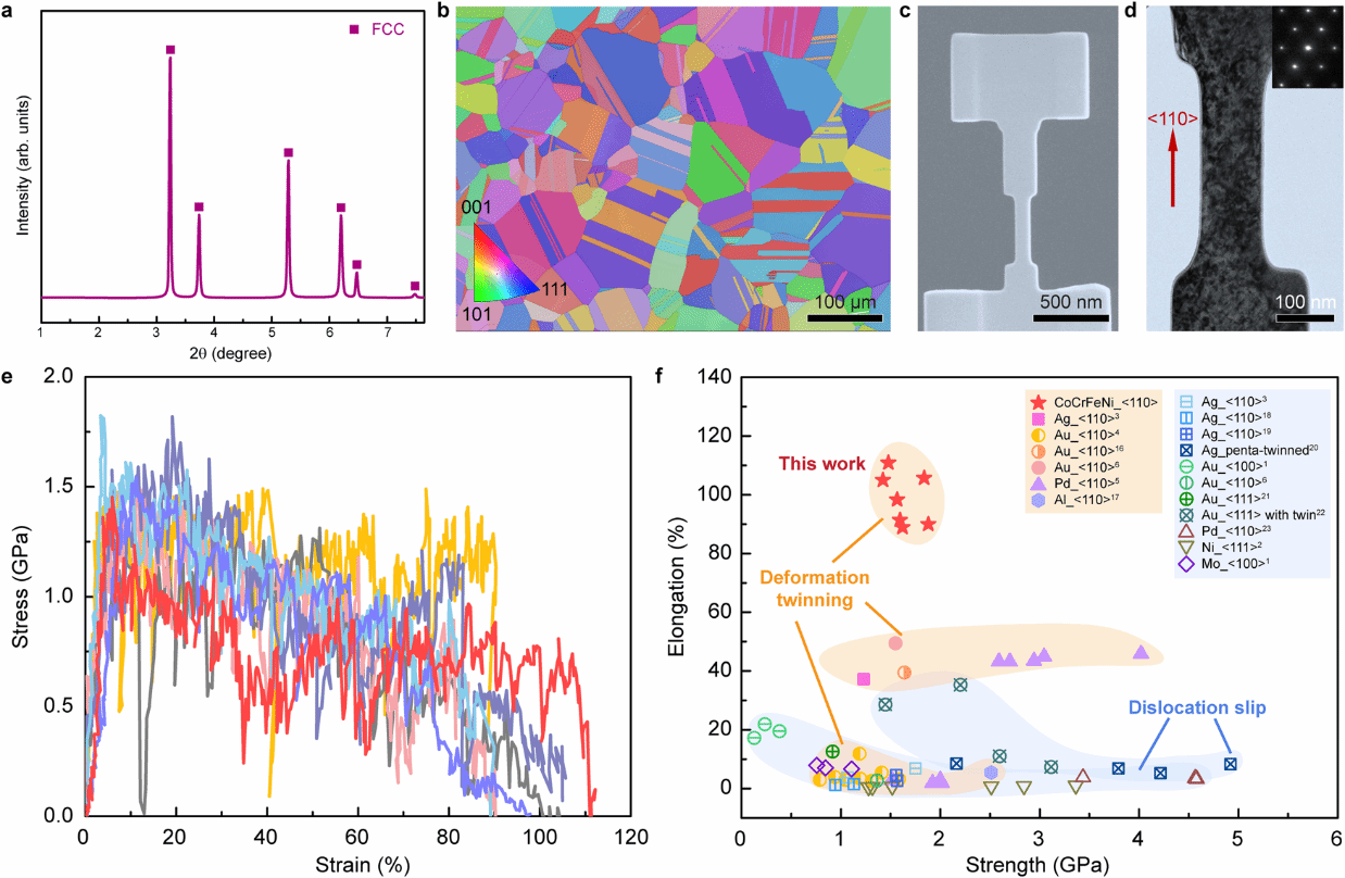 FIB技术加工微纳米柱结合原位电镜研究高熵合金纳米柱,实现室温超110%均匀延伸性。
