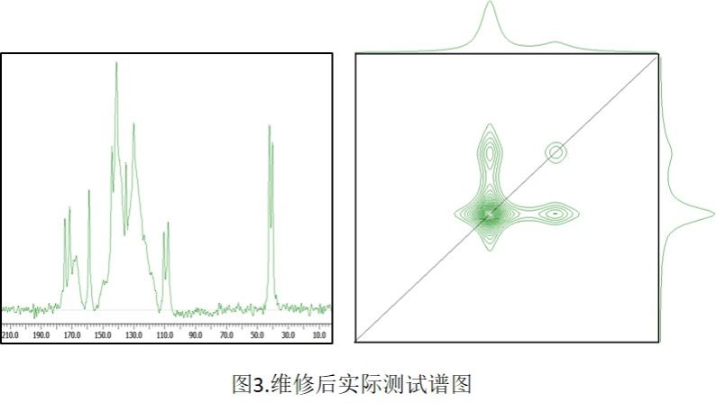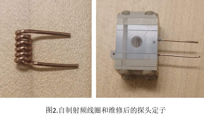为了不耽搁教学科研工作进程,尽快完成该探头的维修,仪器负责人查阅相关文献,在前期工作经验积累的基础上积极探索自主维修。以高纯铜丝绕制射频线圈,进行了探头及磁体腔清洗、射频线圈匝数、长度、直径的优化、定子组装、转速气动参数校准、魔角调整、射频频率、功率参数、匀场参数、90度脉宽优化等一系列维修,成功对3.2mm固体探头完成了自主维修。